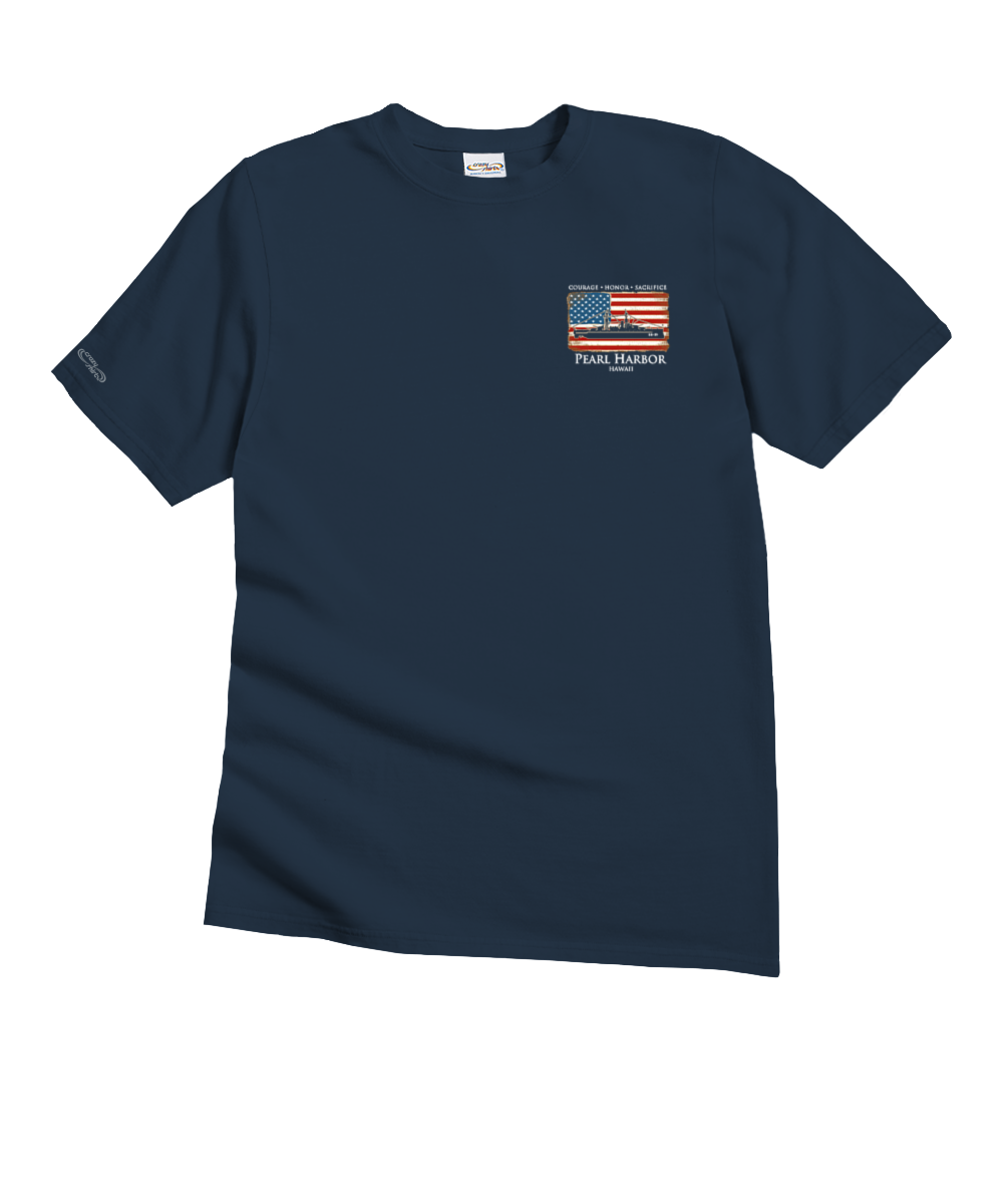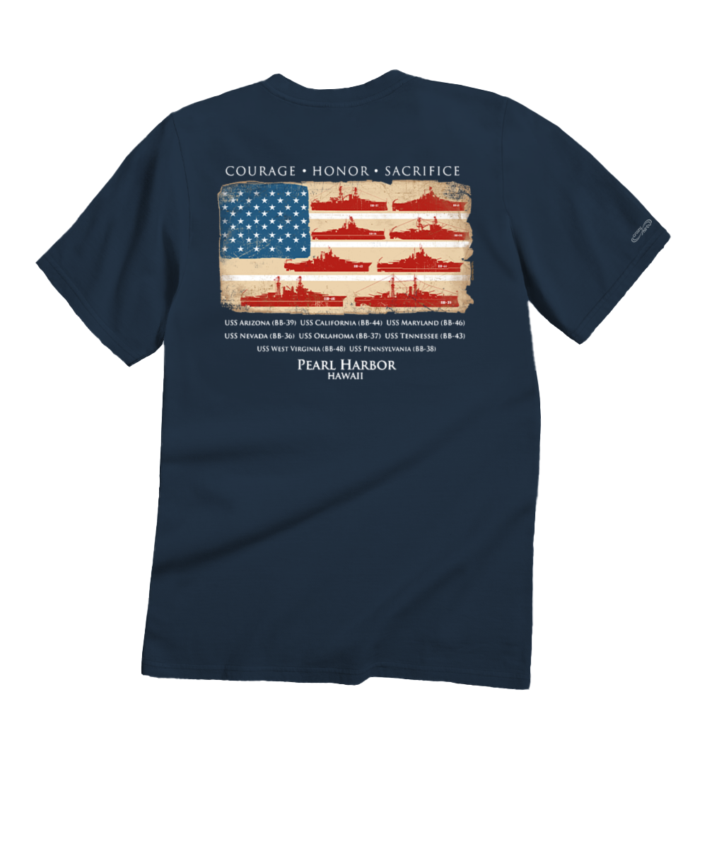 This anniversary t-shirt features the whole fleet that was lined up on Battleship Row in Pearl Harbor on December 7. 1941. A fitting tribute to both the American flag and the troops that fought and died on that fateful day. this t-shirt reminds us that our freedom is built upon courage. honor and sacrifice. Made from 100% cotton that is ring spun then combed to remove impurities. this fabric is luxuriously soft and lightweight yet incredibly strong. We only use environmentally friendly. water-based inks that penetrate the material’s fiber resulting in more vibrant colors. softer feel and artwork that doesn’t crack or peel. Plus. it is proudly printed in the United States for quality you can see and designs that stand the test of time.